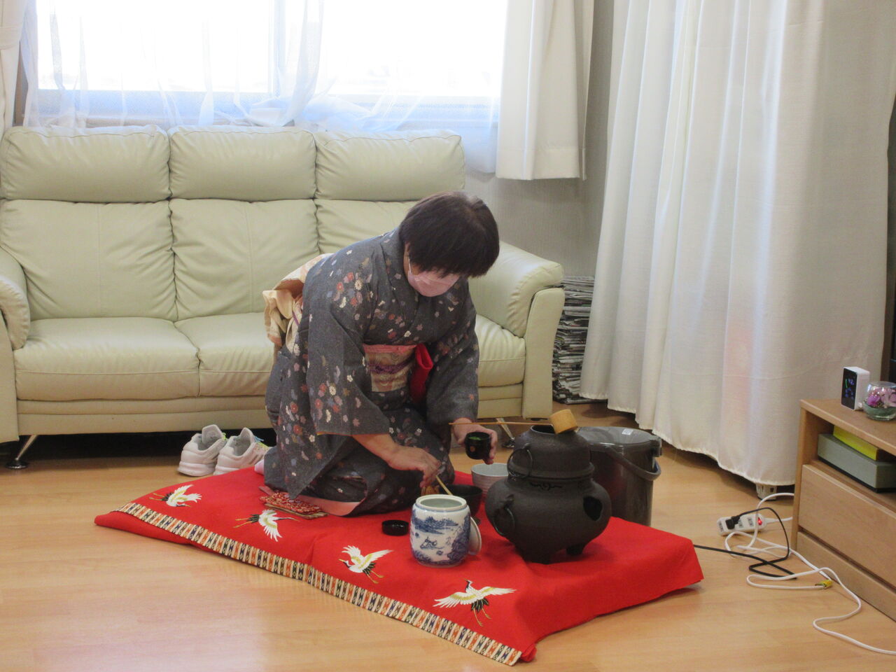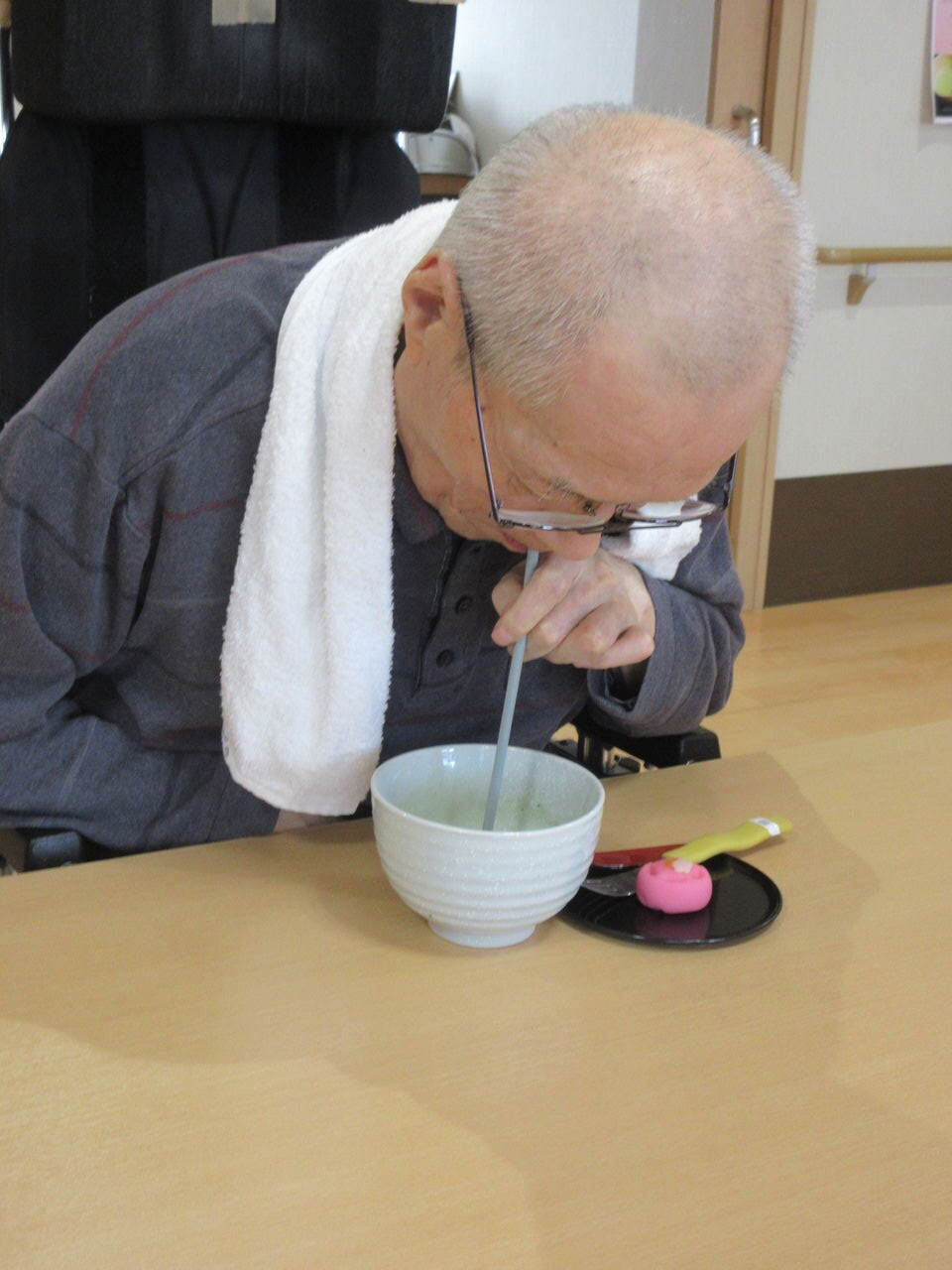 相談員のGさんが綺麗な着物を着てお抹茶を点ててくださいます(^_-)-☆